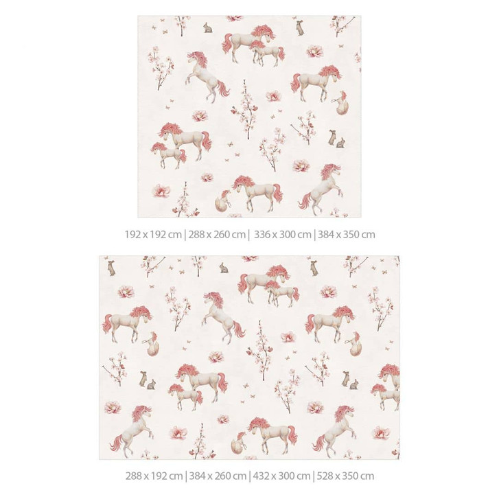 Verleihe dem Kinderzimmer eine magische Atmosphäre mit dieser wunderschönen Mustertapete von Kikki Belle. Die Kombination aus anmutigen Einhörnern, zarten Blumen und charmanten Tieren lädt zum Träumen ein und schafft eine beruhigende und zugleich fantasievolle Umgebung. Das liebevoll gestaltete Muster zeigt elegante Einhörner mit wallenden Mähnen, die ihre magische Welt zwischen zarten Kirschblüten und verspielten Tieren wie Hasen und Schmetterlingen entfalten. Diese harmonische Szenerie regt die Fantasie der Kleinen an und schafft eine gemütliche Atmosphäre zum Spielen, Lesen und Entspannen.