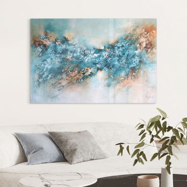 Das Glasbild von Natalie Fedrau bringt die faszinierende Welt der abstrakten Kunst direkt in deinen Wohnraum. Mit einer harmonischen Komposition aus Türkis, Blau, warmem Braun und goldenen Akzenten vermittelt dieses Werk eine Dynamik, die an die kraftvolle Schönheit der Natur erinnert. Die detaillierte Struktur und die fliessenden Übergänge ziehen den Betrachter in deinen Bann und laden dazu ein, immer wieder neue Facetten zu entdecken.