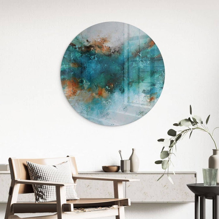 Das runde Glasbild mit dem Werk von Natalie Fedrau ist ein wahrer Blickfang für Ihr Zuhause. Die harmonische Kombination intensiver Blau-, Grün- und Orangetöne vermittelt die Kraft und Schönheit der Natur und ruft die stürmische Energie des Wassers wach. Der runde Schliff verleiht dem Kunstwerk eine moderne und aussergewöhnliche Ästhetik, die in jedem Interieur erstrahlt.