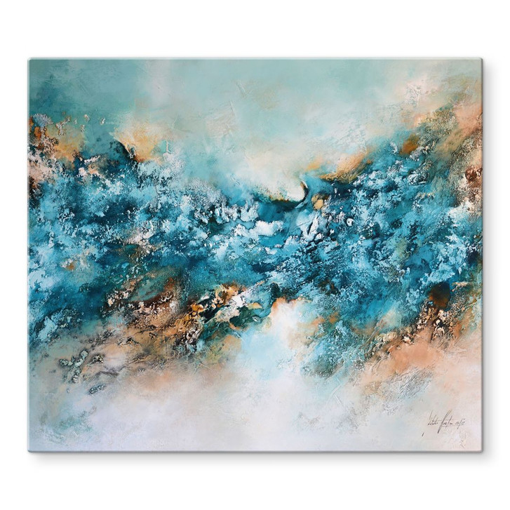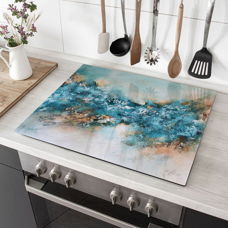 Das zweiteilige Glaskeramik-Kochfeld mit Kunstwerken von Natalie Fedrau bringt Stil und Funktionalität in deine Küche. Das farbenfrohe Design in leuchtendem Türkis, intensiven Blautönen und warmen Braunakzenten verleiht deiner Arbeitsfläche einen Hauch von Exklusivität und Eleganz. Das von den Elementen der Natur inspirierte abstrakte Motiv fügt sich harmonisch in jede Küchenumgebung ein und macht deinen Herd zu einem echten Hingucker.