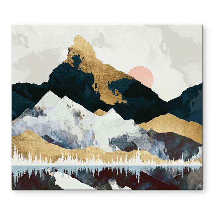 Diese stilvolle Kochfeldabdeckung von SpaceFrog Designs zeigt die erhabene Eleganz einer Winterberglandschaft, die sich eindrucksvoll auf der ruhigen Wasseroberfläche spiegelt. Das kunstvoll gestaltete Motiv kombiniert kühle Blau- und Grüntöne mit eleganten Goldakzenten und verleiht dem Design einen luxuriösen Look. Der zarte Lichtschein des Sonnenlichts im Hintergrund setzt einen warmen Farbakzent und harmoniert perfekt mit den kühlen Tönen der schneebedeckten Berge.