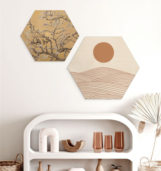 Dieses sechseckige Holzbild von Natasha Playell verbindet minimalistische Kunst mit der natürlichen Schönheit von Holz. Die harmonischen Linien, die eine abstrakte Wüstenlandschaft darstellen, fliessen sanft über die Oberfläche und werden durch die warme Terrakotta-Sonne ergänzt, die Ruhe und Harmonie symbolisiert.