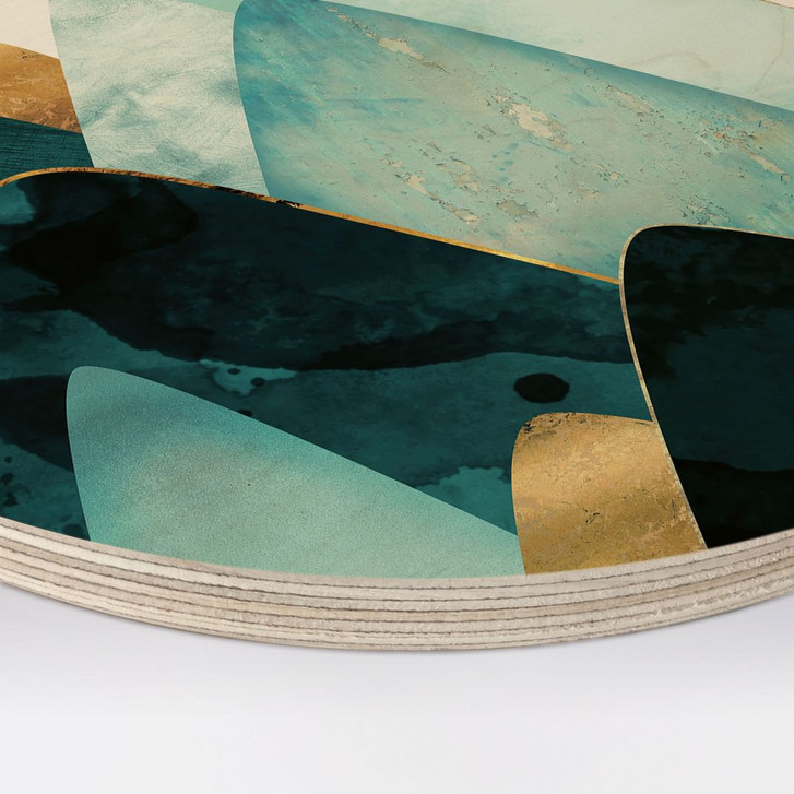 Holzbild Abstrakte Berge in Gold und Blau - SpaceFrog Designs - Rund