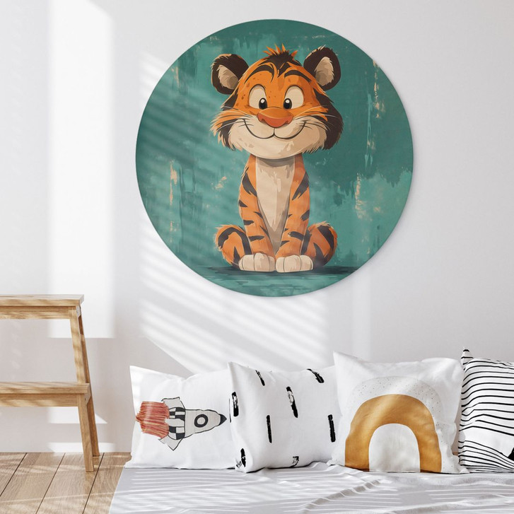 Mit seinem breiten, fröhlichen Lächeln und den grossen, hellen Augen bringt dieses kleine Tigerbaby eine wunderbare Leichtigkeit in jeden Raum. Die warmen Orangetöne seines Fells in Kombination mit dem leuchtenden türkisfarbenen Hintergrund ergeben eine aufregende Farbkomposition, die für Lebensfreude, Abenteuerlust und Energie steht. Dieses runde Holzbild ist die perfekte Ergänzung für ein liebevoll gestaltetes Kinderzimmer oder als tierisches Highlight in modernen Wohnräumen.