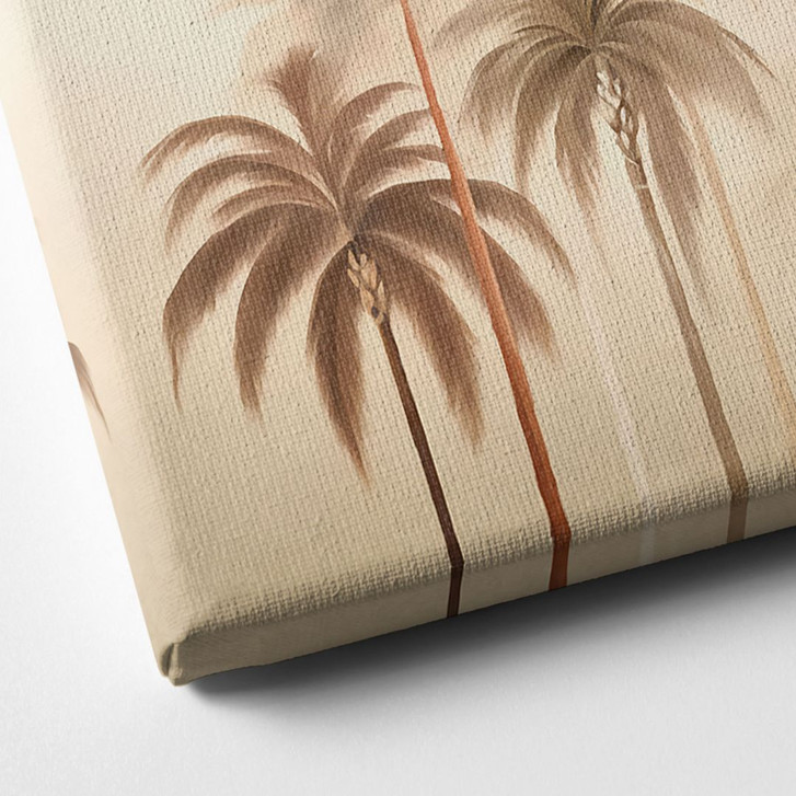 Dieser Leinwanddruck bringt die friedliche Schönheit einer tropischen Palmenlandschaft in Ihren Wohnraum. Die sanften Farbtöne von erdigen Brauntönen und warmen Orangetönen schaffen eine entspannte, fast verträumte Stimmung, die sich perfekt in jede Inneneinrichtung einfügt. Die Palmen, die sich in Nebel gehüllt in Richtung Himmel strecken, vermitteln ein Gefühl von Weite und Gelassenheit.