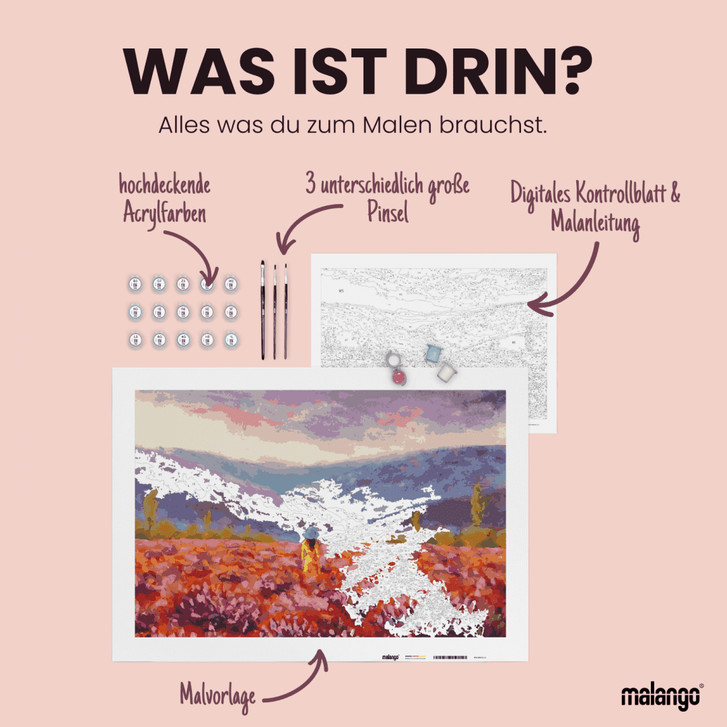 Jedes Set enthält eine vorgedruckte Leinwand, die in verschiedene Abschnitte unterteilt ist, die jeweils mit einer Nummer versehen sind. Diese Zahlen entsprechen den Farben der mitgelieferten Acrylfarben. Man folgt einfach den Anweisungen und trägt die entsprechenden Farben auf die nummerierten Bereiche auf. So kann jeder, unabhängig von seinen künstlerischen Fähigkeiten, ein atemberaubendes Kunstwerk schaffen. Alles in allem ist das Malen nach Zahlen eine wunderbare Möglichkeit, die Freude am Malen zu entdecken und gleichzeitig seine Kreativität auszudrücken. Es ist ein ideales Hobby für Menschen jeden Alters und ein perfekter Einstieg in die Welt der Kunst. Unsere Malen-nach-Zahlen-Sets werden in Deutschland umweltfreundlich mit Solarenergie hergestellt.