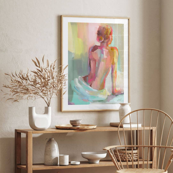 Es ist Zeit für einen neuen Look. Mit diesem Wandbild kommt die Wand besonders eindrucksvoll zur Geltung. Und dieser Kunstdruck setzt wunderbare Farbakzente an der Wand. Das Porträtgemälde von Jenny Westenhofer zeigt einen weiblichen Rückenakt. Die Frau sitzt mit dem Rücken zur Künstlerin und ist nur mit einem Tuch an der Hüfte bedeckt. Das Modell und der Hintergrund sind mit Acrylfarben in verschiedenen Pastelltönen dargestellt, was dem Gesamtwerk eine warme, weiche Note verleiht.