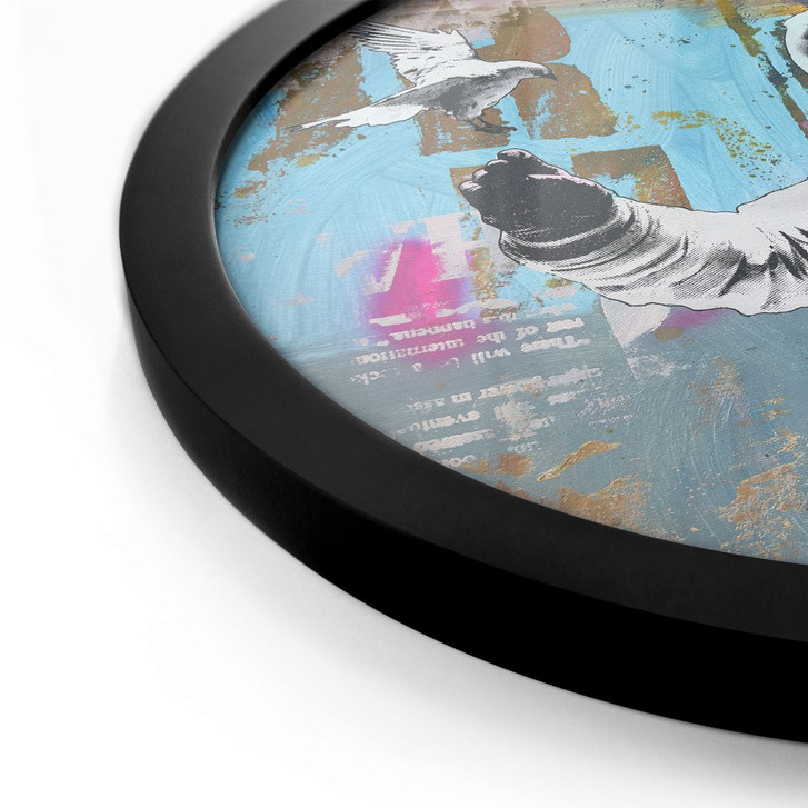 Dieses kreisförmige Poster von Kuryliuk zeigt eine kraftvolle Collage aus urbaner Kunst und futuristischem Realismus. Im Mittelpunkt steht ein Astronaut in einer zeitlosen monochromen Darstellung, dessen ausgestreckte Hand einer Taube Frieden schenkt. Die Taube – ein Symbol für Hoffnung und Freiheit – fliegt inmitten eines lebendigen Hintergrunds, der durch farbenfrohe Graffiti-Elemente und dynamische Farbexplosionen geprägt ist.