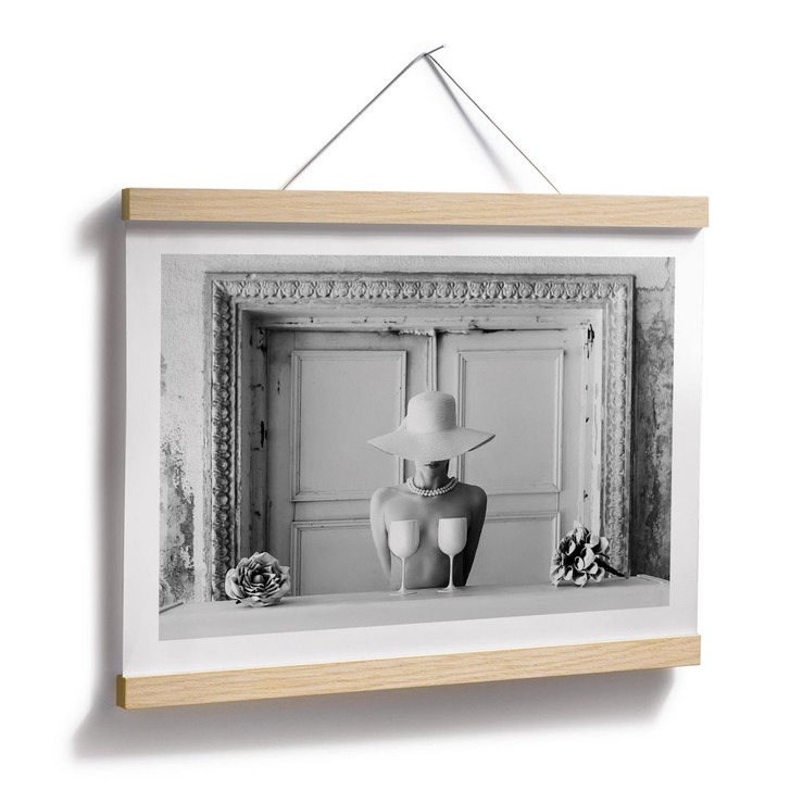 Dieses kunstvolle Poster bringt die raffinierte Schwarz-Weiss-Fotografie von Ruslan Bolgov in dein Zuhause. Die Szene zeigt eine elegante Frau mit breitkrempigem Hut und Perlenkette, die vor einer historischen Kulisse in Szene gesetzt ist. Zwei geschickt platzierte Champagnergläser erzeugen eine faszinierende optische Täuschung, die den Betrachter in deinen Bann zieht.