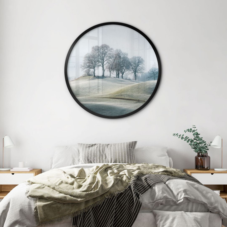 Dieses runde Poster von Ulrike Eisenmann präsentiert die faszinierende Schönheit einer winterlichen Hügellandschaft. Die sanften Wellen der frostigen Hügel und die zentral positionierten Bäume vermitteln eine harmonische und beruhigende Atmosphäre, die jeden Raum aufwertet.