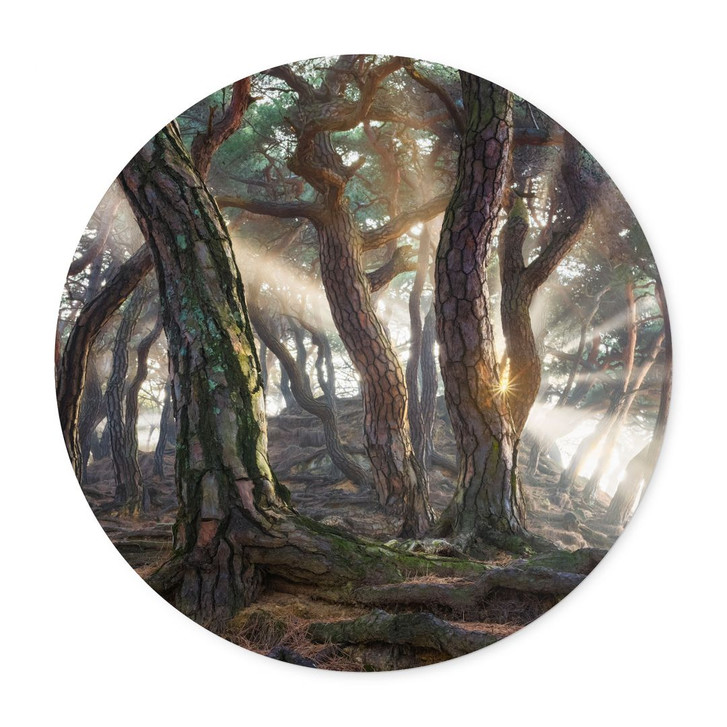 Mit diesem runden gerahmten Poster kannst du die faszinierende Schönheit der Natur in deine Wohnräume bringen. Es verbindet die Mystik eines uralten Waldes mit zeitgenössischem Design und schafft eine Atmosphäre der Ruhe und Inspiration, die jeden Raum bereichert.