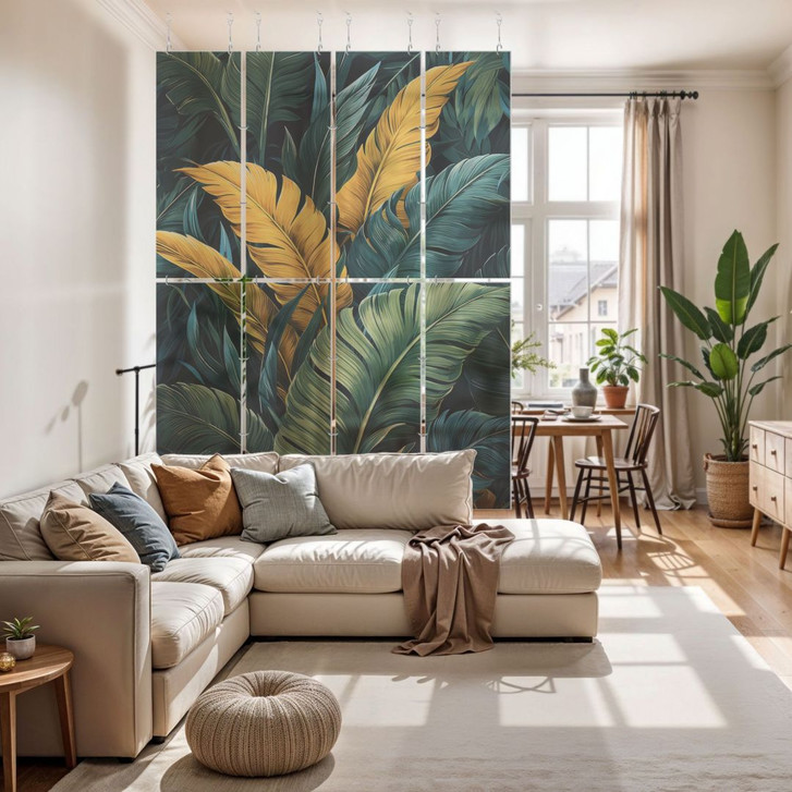 Verleihe deinem Wohn- oder Arbeitsbereich mit diesem hochwertigen Acrylglaselement eine faszinierende, tropische Atmosphäre. Das kunstvolle Motiv zeigt eine opulente Komposition aus grossen Palmen- und Bananenblättern in sattem Dunkelgrün, kombiniert mit edlen Gold- und Ockertönen. Die harmonische Farbpalette schafft ein luxuriöses, stilvolles Ambiente und bringt natürliche Eleganz in deine Räume.