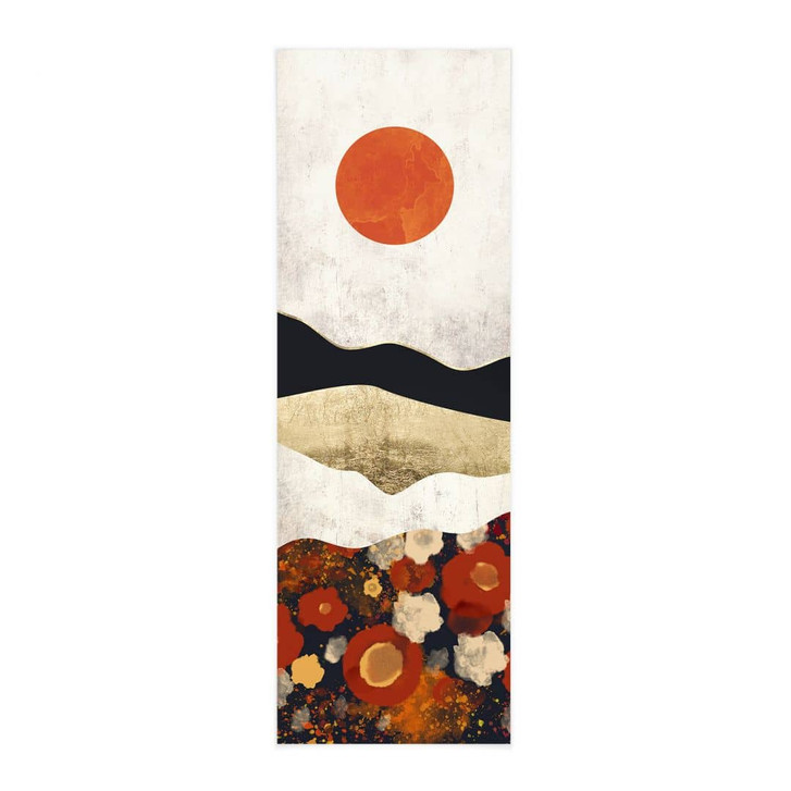 Dieses Panorama-Stoffbild von SpaceFrog Designs zeigt eine herbstliche Berglandschaft, die durch harmonische Farben und kunstvolles Design besticht. Die fliessenden Linien der Berge in Schwarz und Gold ziehen sich sanft durch das Motiv und schaffen eine ruhige, beruhigende Atmosphäre. Die organischen Blumenmuster im unteren Teil des Bildes leuchten in warmen Rottönen, Orangetönen und Beigetönen und erinnern an die farbenfrohe Pracht eines goldenen Herbsttages. Die Kombination der kräftigen Farben und der klaren Linien der Berglandschaft erzeugt eine faszinierende Tiefe und lässt das Motiv erstrahlen.