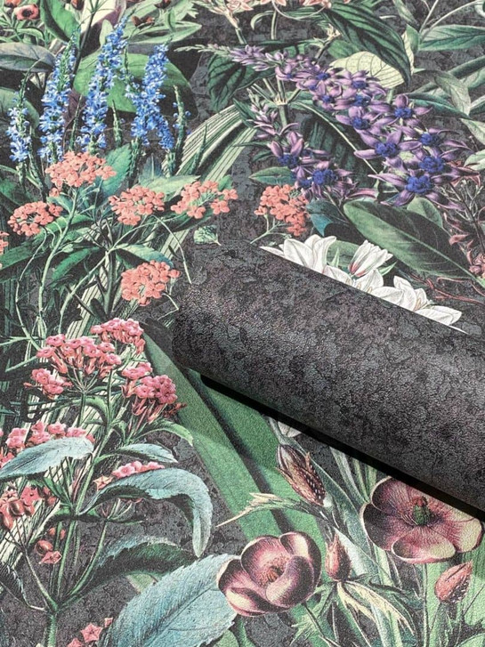Vliestapete mit bunter Blumenwiese schwarz, grün floral
