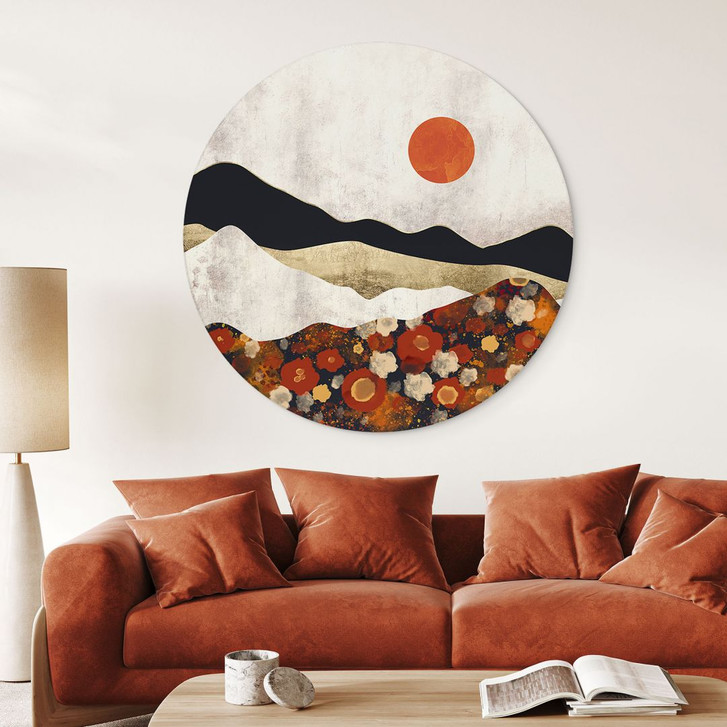 Dieses runde Wandbild von SpaceFrog Designs zeigt eine herbstliche Berglandschaft, die durch sanfte Farben und harmonische Formen besticht. Die minimalistische Darstellung der Berglinien in Schwarz und Gold bildet einen ansprechenden Kontrast zu den organischen Blumenmustern in leuchtendem Rot, Orange und Beige. Die klare Silhouette der Berge und die handgezeichneten Details verleihen dem Kunstwerk eine besondere Tiefe und Eleganz. Die helle Sonne am Himmel fügt sich als kraftvolles, zentrales Element in das Bild ein und unterstreicht die warme, beruhigende Stimmung.