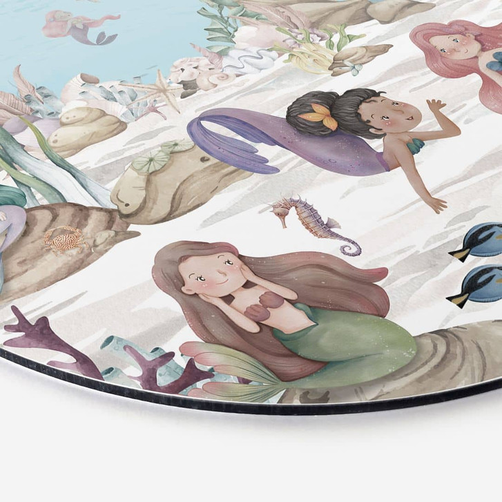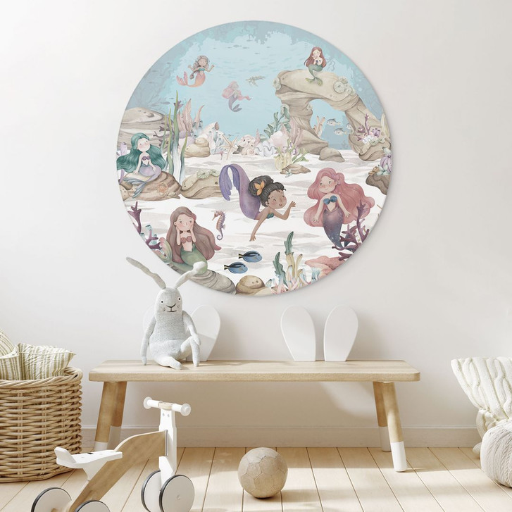 Dieses runde Kunstwerk von Oliver Robins entführt dich in eine faszinierende Unterwasserwelt voller märchenhafter Details. Die liebevoll gestalteten Meerjungfrauen in zarten Pastelltönen scheinen in ihrer harmonischen Umgebung aus bunten Korallen, weichem Sandboden und geheimnisvollen Felsen zu schweben. Jede Meerjungfrau ist einzigartig dargestellt und lädt dazu ein, ihre individuelle Geschichte zu entdecken.